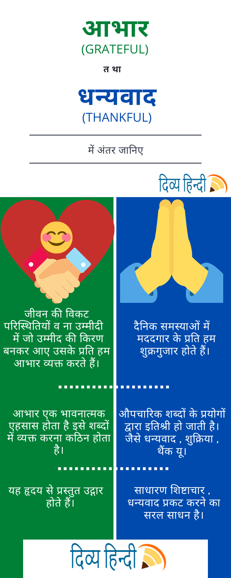 यदि विकट परिस्थितियों, समस्याओं , समाधान और निर्णयों में कोई हमारा साथ , उम्मीद , सहयोग ,प्रेरणा दे तो वह धन्यवाद नहीं , आभार प्रकट करने योग्य होता है। उसका सहयोग जीवनदायिनी दवा के समान होता है । ऐसे में भाषा की परिभाषाएं खत्म हो जाती हैं और सिर्फ भावनाएं रह जाती हैं , जिसे आभार कहा जाता है।